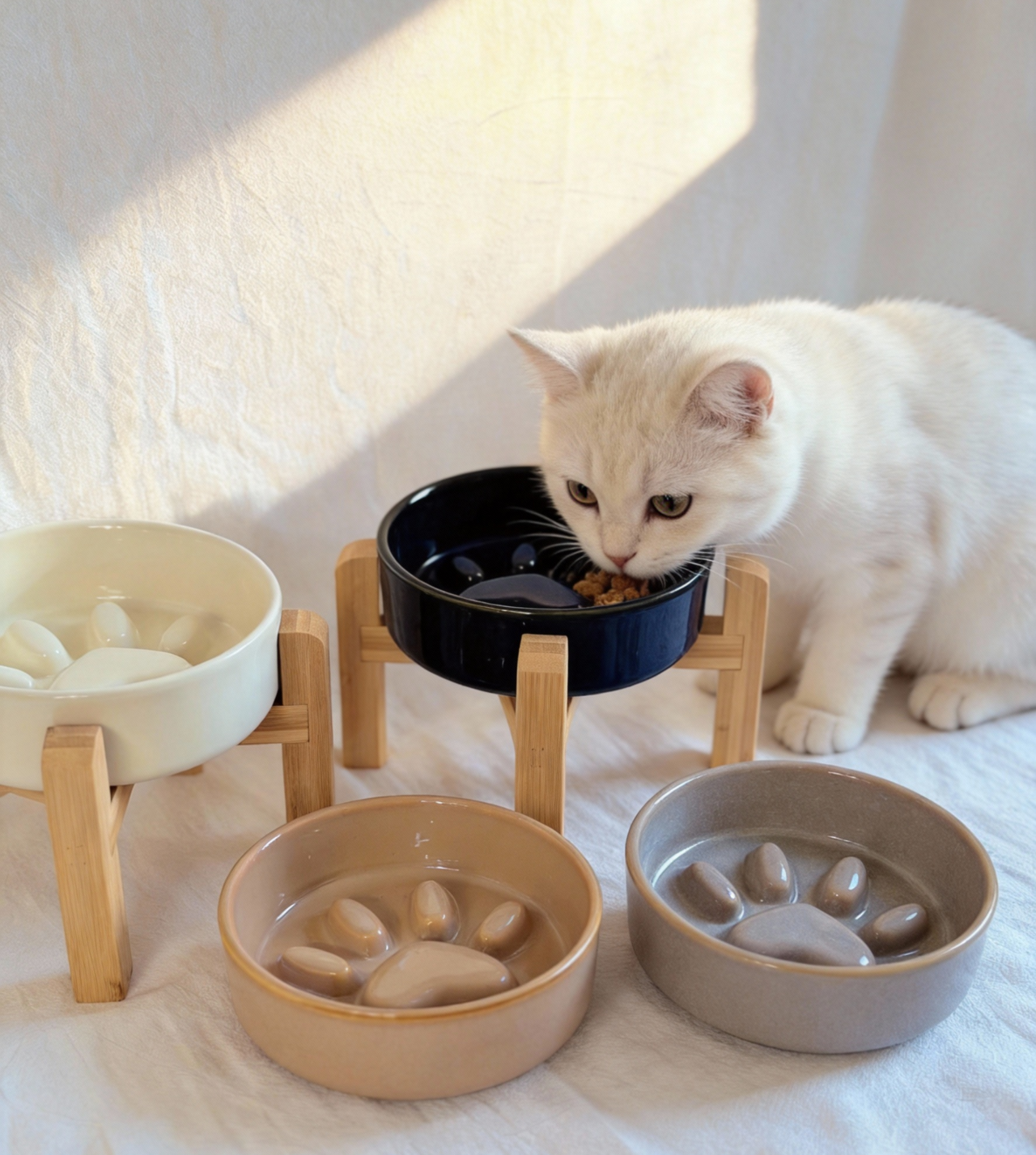帶有架高設計的餐具,能讓貓咪以更符合人體工學的姿勢進食,不僅保護頸椎,也避免臉部過度埋入碗中。